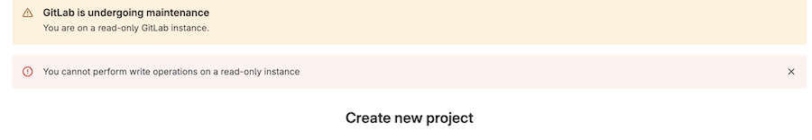 . All write operations fail, both through the CLI and Web IDE with the error message: Git push is not allowed because this GitLab instance is currently in (read-only) maintenance mode.